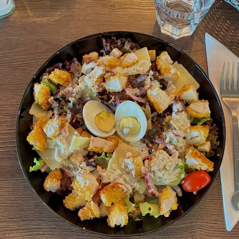 Salade, copeaux de parmesan, filets de poulet panés, tomates, oignons, sauce caesar maison